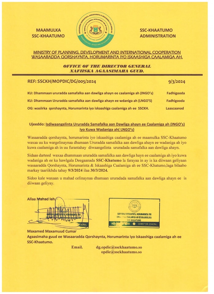 Ministry of Planning, Development and Intl. Coop. (MoPDIC) invites you to join the growing number of NGO and iNGO partners committed to rebuilding Sool, Sanaag and Cayn regions of SSC-Khaatumo.