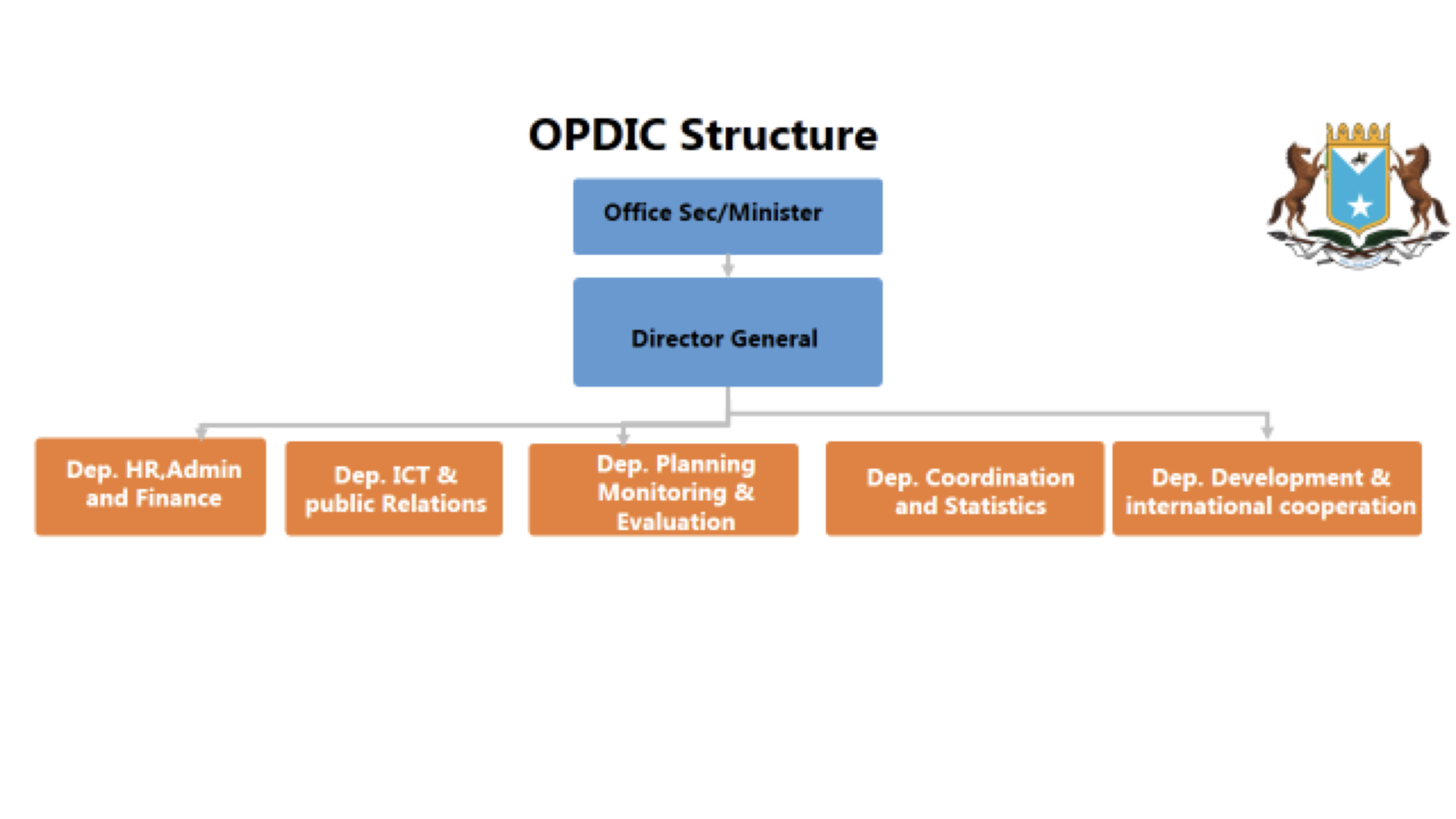 The organization chart consists of political leadership and non-political officials. The Minister is in charge, assisted by a Deputy Minister and Director General. The Director General reports directly to the Minister. The nine departments report to the Director General.